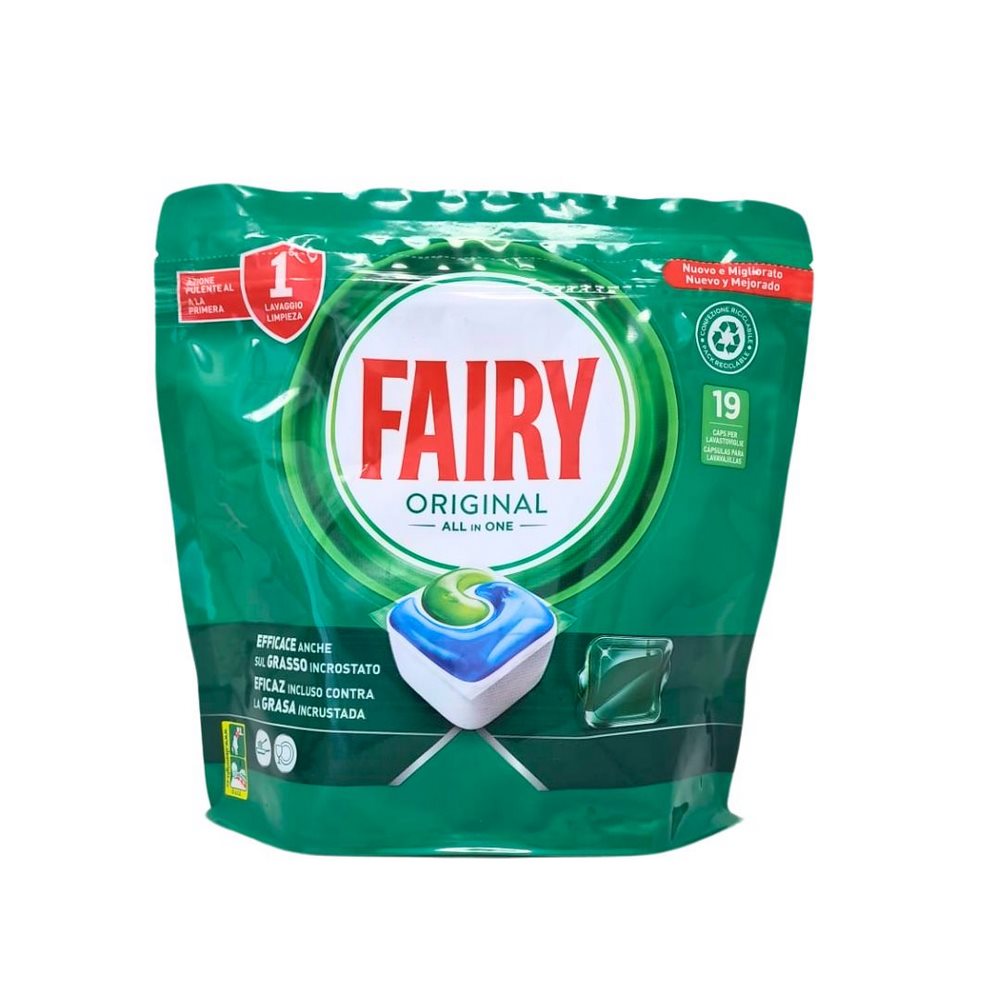 Le pastiglie FAIRY original all in onesono efficaci anche sul grasso incrostato. Azione pulente al primo lavaggio.